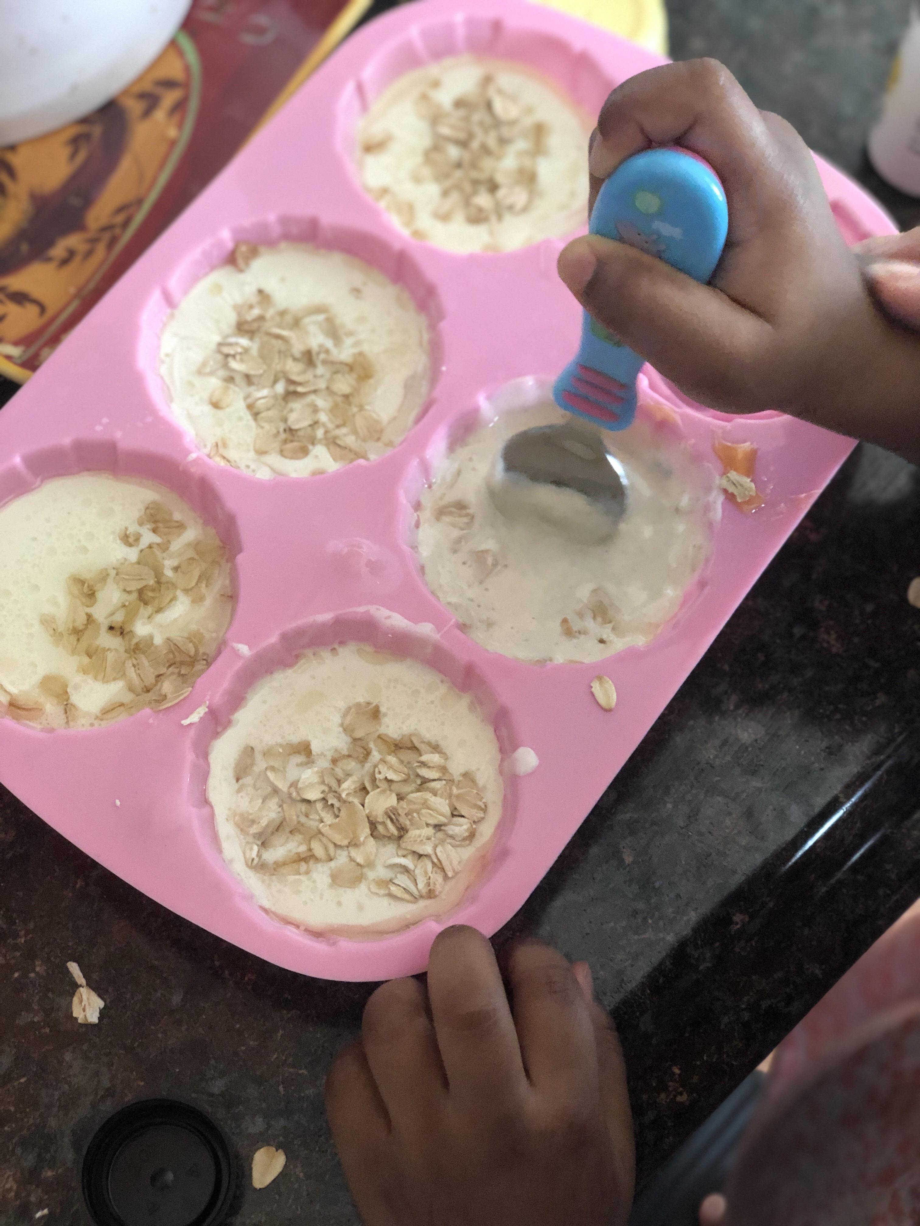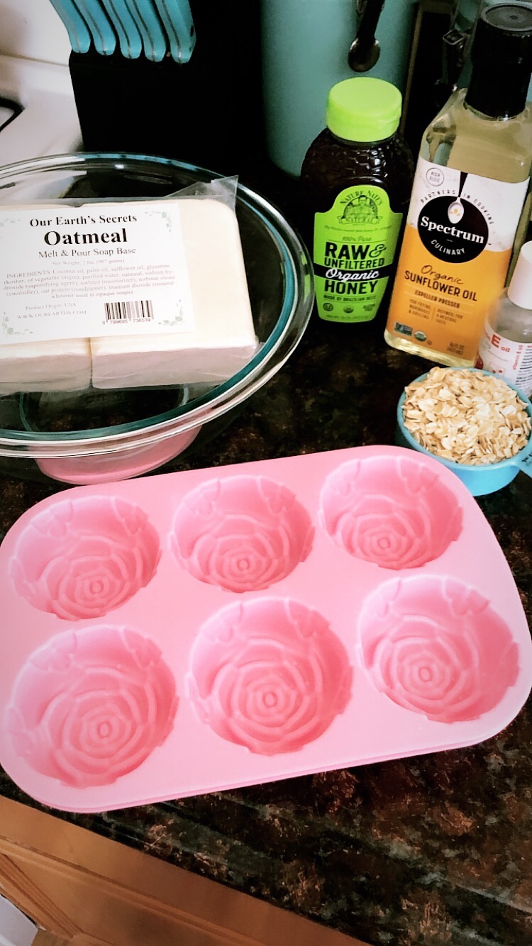 In the picture above are some of the main ingredients I used! I chose to use sunflower oil and vitamin E oil due to their many benefits (I’m hoping they will work for my kids skin) which I will post later in this post! You can play around with whatever oil you feel will moisturize your skin. The oatmeal melt and pour soap base that you see in the glass bowl I found on amazon! I will link it later! That is 2 pounds, but I only used 1 pound. I was able to make 11 bars of soap!