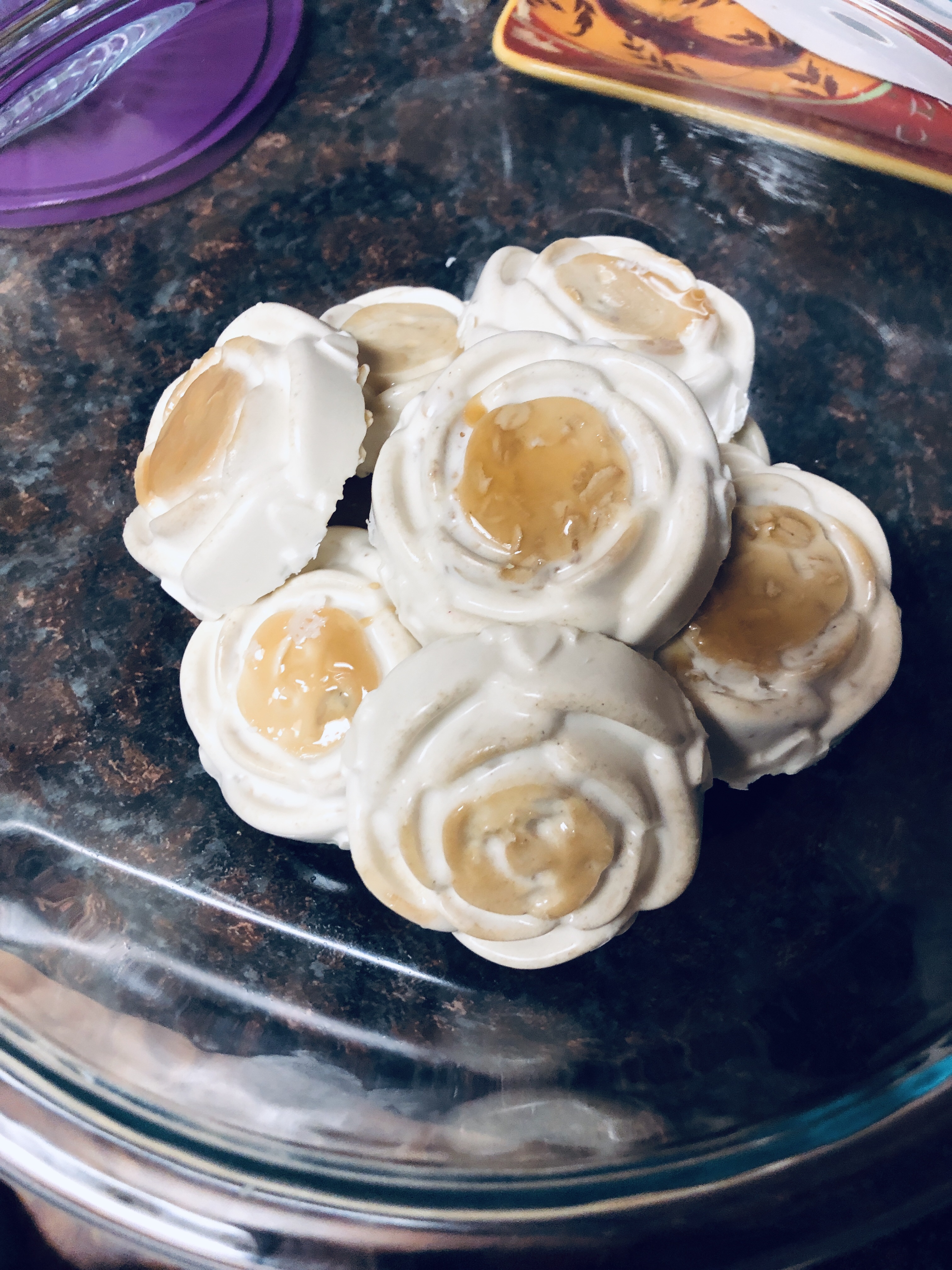 Here are the results of my first try making homemade soap ! Pretty cool! What you see in the center is the organic honey 🍯 I would suggest keeping the remaining bars you aren’t using in the fridge until they are ready to be used!